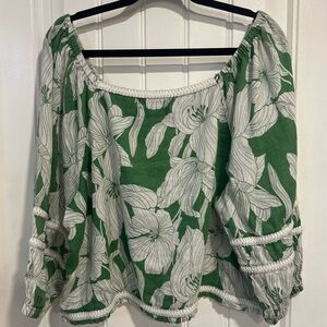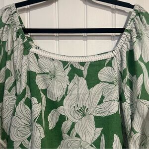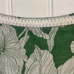 Elegant Tahari linen piece. Crafted from European flax. Features a stylish green and white floral design.