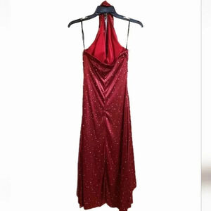 Gorgeous red satin knit cocktail/formal halter dress by My Michelle with sparkle details all over the dress, and a silver rhinestone brooch decoration in plunging v-neckline. Neckline has a unique drape and pleated design. Fully lined with lightly padded bust. Stretch fabric with shine. Flare high-low hem.