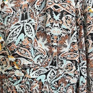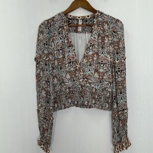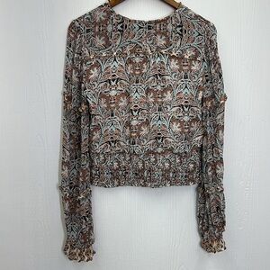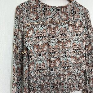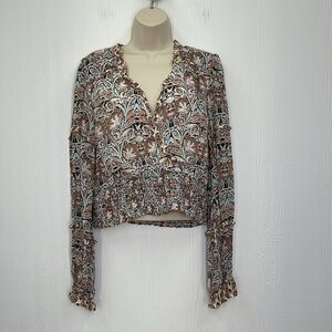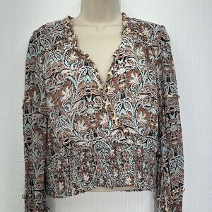Anthropologie - Paisley Floral Printed Blue Motif Ruffle Deep V Long Sleeve Blouse Size Medium