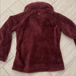 Warm maroon fleece pullover with button accents. Ideal for chilly days. Very warm and cozy. Hood is zipped up in the back. Women’s size medium.