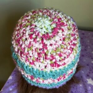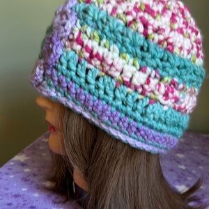 Stay cozy and stylish with this multicolor crochet beanie featuring a beautiful flower design. Perfect for adding a pop of color to any outfit. Crochet handmade flower beanie medium soft acrylic yarn new clean never worn new. Warm hat wash suggestion in tied pantyhose sock or cloth laundry bag to prevent piling fuzz and maintain form and beauty. Moveable flower.