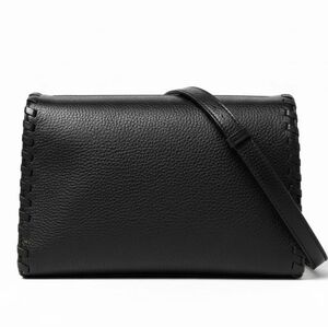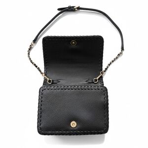 Tory Burch Marion Combo Crossbody Bag in black. This model is characterized by its pebbled leather construction and signature whipstitch trim along the edges of the front flap.