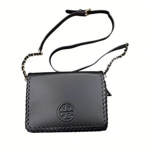 Classic Tory Burch leather black crossbody with gold accents and hardware. Has an internal zippered pocket and slots for cards. Stylish, functional, and versatile.
