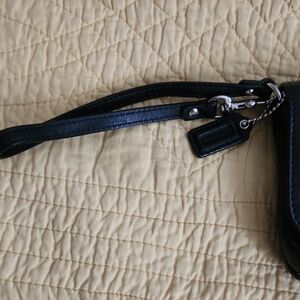 EUC Coach sleek black leather design clutch w adjustable wristlet strap. Features Coach logo in silver hardware. Ideal for stylish outings.