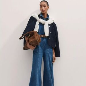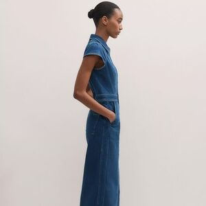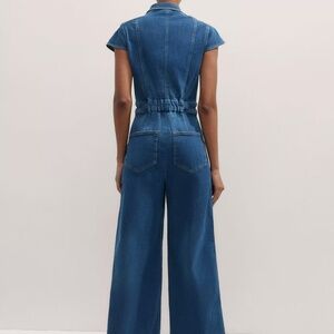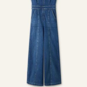 Flattering and Stylish blue denim jumpsuit. Features leg lengthening design. Short cap sleeves which perfectly balance the wide legs with a zip front. I am a size 8 in this brand and gave in to an urge to see if a six would work. The fabric has a comfortable stretch, but it is a bit snug across the chest. Check out the manufacturer site for more detail!