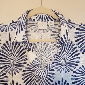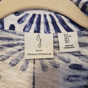 Joie Blue & White collared v neck patterned boxy tee linen blend sz L
