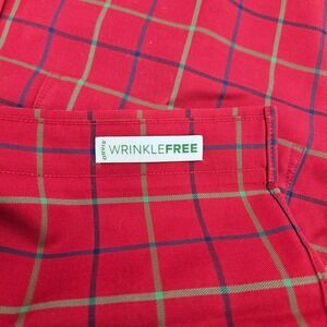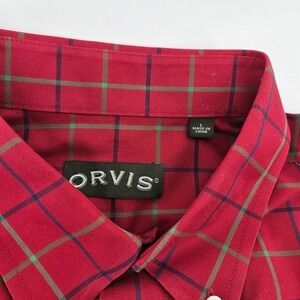Orvis wrinkle-free button-down shirt crafted from 100% cotton in a vibrant red plaid pattern with green and navy accents. This long-sleeve shirt features a classic button-down collar, a single chest pocket with a button closure, and adjustable button cuffs. Designed for a crisp look throughout the day, it offers a comfortable fit suitable for casual or outdoor wear.