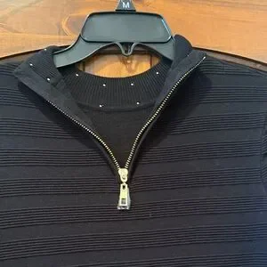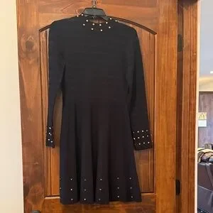 This elegant black dress features stunning gold accents, perfect for any occasion. Its sophisticated design and classic color make it a versatile addition to your wardrobe. Worn once.
