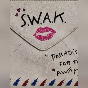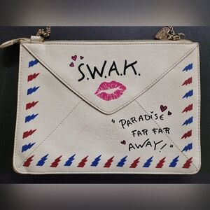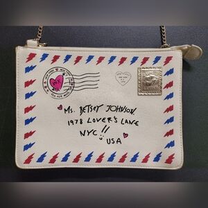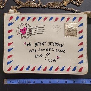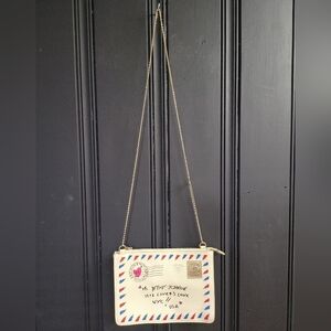 Incredibly unique novelty crossbody clutch bag. Americana envelope themed bag with fun postage details. Features zipper closure and gold tone crossbody chain.