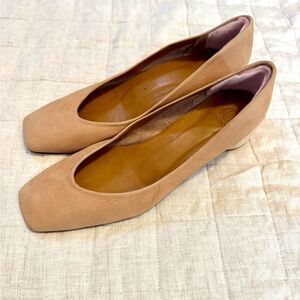 This perfectly formed pump in a goes-with-everything faun hue is set apart from the crowd with its solid, architectural block wood heel. Slip-on. Easy height for everyday wear. Custom and individually crafted.