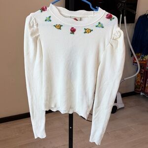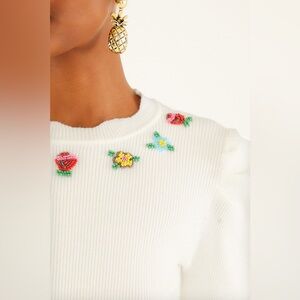 Embroidery Knit Top by FARM Rio. Softly structured with puffed shoulders, this ribbed knit showcases a playful round neckline adorned with vibrant hand-embroidered floral motifs. The scalloped edges at the hem and collar add a gentle wave of femininity, while the off-white backdrop creates a fresh canvas, making this top a warm and inviting piece to brighten your everyday wardrobe.
