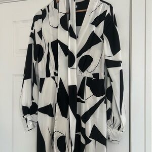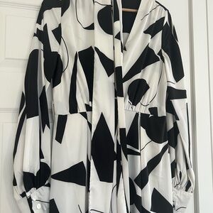 Chic long sleeve maxi dress with abstract black and white design. Features a deep V-neck and high slits. Perfect for bold fashion statements.
