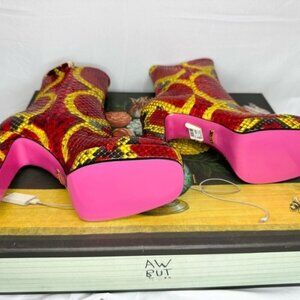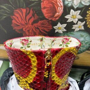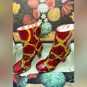Python Heels boots from Gucci , delicate, pristine snake skin in red and yellow. Pink bottoms.