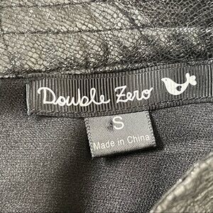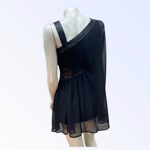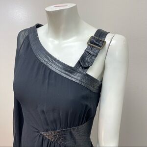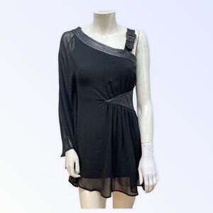 Size small mini dress with a buckle like strap on one side and a kimono sleeve on the other. Faux leather details.