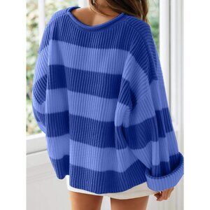 Women's Pullover Drop Shoulder Long Sleeve Retro Stripe Dark Blue Fall Sweater