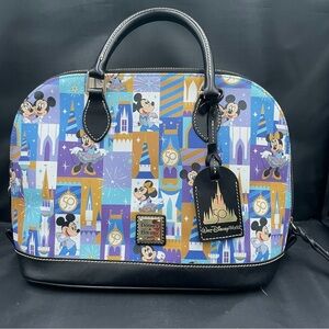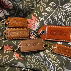 Bright pink leather keychain by Coach. Features silver chain and stitching detail.