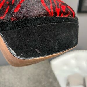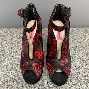 BETSEY JOHNSON Black/Red Roses Pony Hair Peep Toe Stiletto Platforms Whimsy 6.5