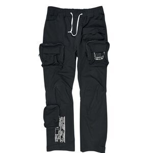 Smoke Rise black utility/techwear cargo pants with multiple pockets + zipper details and futuristic graphic accents.