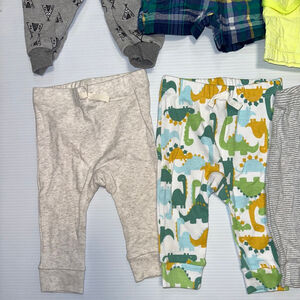 This 8-piece lot of baby bottoms for 6 months includes a mix of pants and shorts from brands like Okie Dokie, Carter's, and Baby Essentials. The collection features grey pants with a teepee print, blue and green plaid shorts, neon yellow cargo shorts, camouflage shorts, light grey drawstring pants, dinosaur print pants, grey striped pants with button detail, and solid khaki drawstring pants. Materials vary, with some items being 100% cotton and others a cotton/polyester blend. All items appear to be in good pre-owned condition with no significant visible imperfections.
