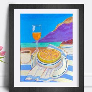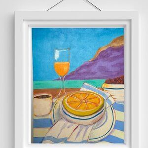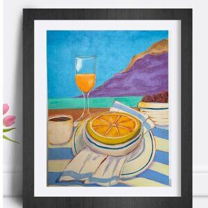 Vibrant painting featuring a beachside scene with a glass of orange Juice and a plate with a grapefruit slice. Perfect for adding a splash of color to any room.