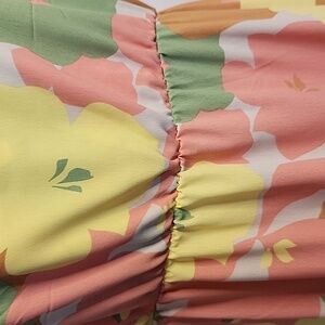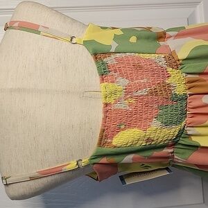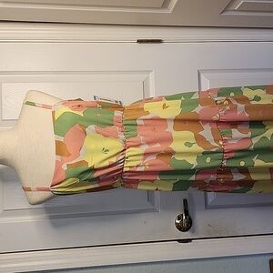 Add a pop of color to spring gatherings with this stunning floral midi dress Perfect for any occasion. Great for Summer activities. Pink, light green, yellow.