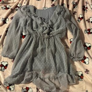 This elegant gray dress features a delicate polka dot pattern and a flattering silhouette. Perfect for any occasion, it offers both style and comfort.
