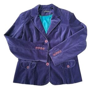 Beautiful Liz Claiborne tailored blazer in a rich deep purple with a luxe velvet finish and vibrant teal lining. This jacket has a flattering structured fit with feminine seaming, flap pockets, and statement button details at the cuffs. Perfect for workwear, business casual, or adding a pop of color to an outfit.