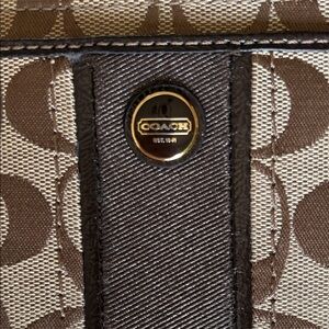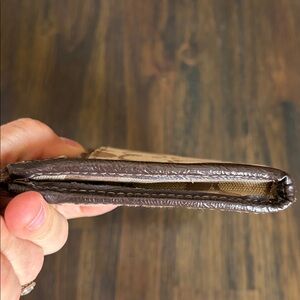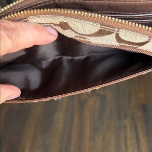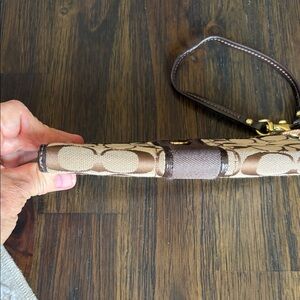 Elegant wristlet with iconic Coach pattern. Features a sleek strap and gold-tone hardware. This fits a iPhone 16 very roomy has several card slots a back zipper pocket. Inside super clean No Callouts !