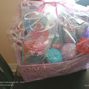 Vibrant gift basket filled with toys and treats. Perfect for any occasion. Anna Elsa Disney Frozen custom girls basket filled with Disney's Anna and Elsa themed items perfect for birthdays Valentine's Day a