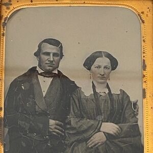 Early 1850's 1/6 Plate Ambrotype Photograph of a Young Couple. Man with Vest, Tailcoat, and Sideburns, and Woman with Day Dress w/ Pagoda Sleeves