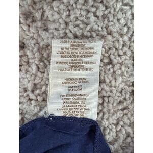 Free People navy blue mini skirt showcases a bohemian aesthetic with its smocked elastic waistband and intricate geometric embroidery. This tiered design features a double-layered, ruffled hem with delicate contrast piping, creating a playful and airy silhouette. Crafted from a lightweight rayon-cotton blend, it includes a soft cotton lining for comfort. The waist is further accented with tiny metallic bead-like details, adding a subtle touch of shimmer to this versatile festival-ready piece.