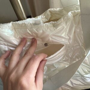Stylish iridescent white tote bag perfect for any occasion. Features a spacious interior and durable straps.