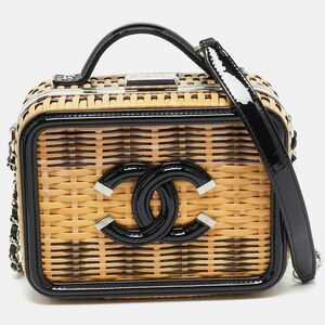 Chanel Cc Filigree Vanity Case Small Beige/black Rattan And Patent Leather