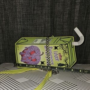 Quirky crossbody bag shaped like a juice box. Lime green with purple and pink details. Eye-catching and playful design.