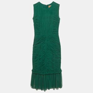 Tory Burch Emerald Green Mesh Rushed Ethel Midi Dress Xs