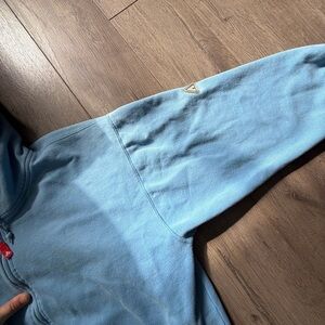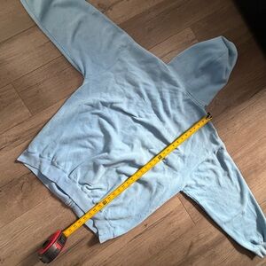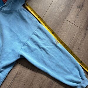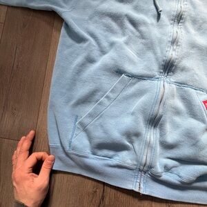 Super dope oversized fit and helllaaaa comfortable. Good for a cold day. nice powder blue type fade to it too. Not any noticeable flaws. measurements can be seen in the listing photos. size XL
