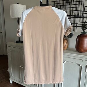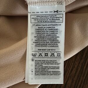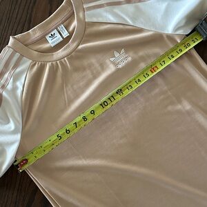 Adidas midi dress in tan and white. Features iconic logo and sporty design. Perfect for casual wear.