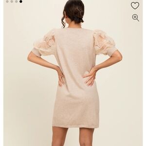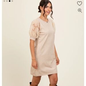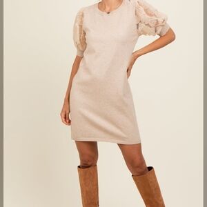 Chic mini dress with lace puff sleeves. Soft beige tone. Perfect for stylish outings, baby shower, or just an elevated cozy look!