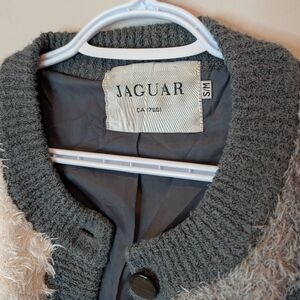Beautiful vintage Jaguar knit cardigan featuring a unique patchwork design with mixed textures, soft fuzzy panels, and delicate embroidered floral details. Finished with front button closure and cozy relaxed fit, perfect for cottagecore, grandma-core, or layered fall styling.