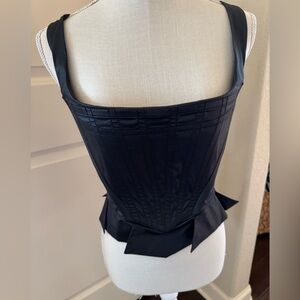Style: Structured corset/bustier with characteristic pointed hem and architectural seam lines.