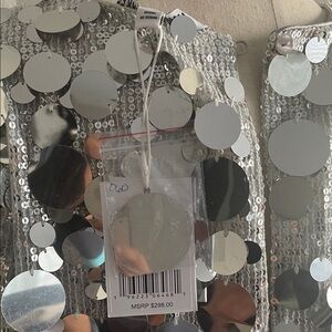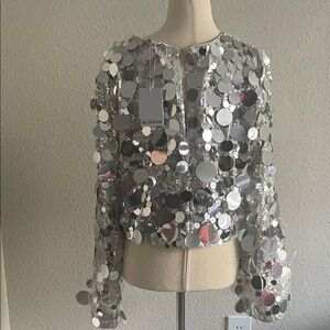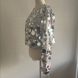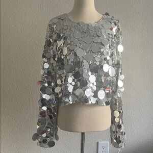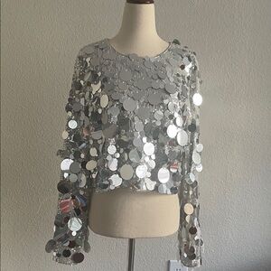 The Denise Sequin top is a crop top with long flare sleeves in sequin fabric, featuring large piette and feather details, It adds instant glam to your ensemble