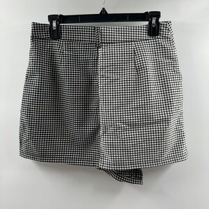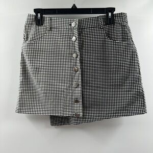 Forever 21 skirt with a bold black-and-white cross plaid pattern and an asymmetrical button-up front. Features shiny silver buttons and convenient side pockets. Size medium. A super fun and trendy statement piece for fall/winter outfits.