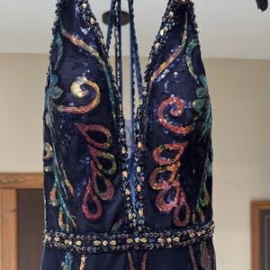 Stunning halter dress with colorful sequin embellishments. Perfect for special occasions like prom or evening formal. Pit to pit 18in, narrowest waist 14in and total length from armpit to floor 49.5 in. See the video because this dress is stunning. Make a statement in this one. Worn once. Open back