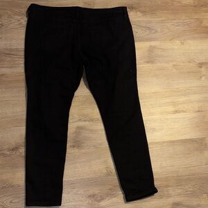 Edgy black skinny jeans with distressed details. Perfect for a modern look. Comfortable and stylish.