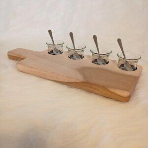 Handcrafted charcuterie/serving board made from beautiful, hand-selected hard maple wood — perfect for entertaining, cheese boards, butter service, dips, or everyday use!Includes 4 clear glass serving cups (recessed/embedded for stability)