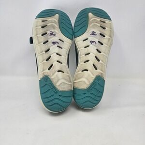 ECCO flat sneakers combine a sporty aesthetic with everyday comfort. These slip-on shoes feature a breathable mesh and textile upper in a dark charcoal grey with vibrant teal accents. The design includes a decorative crisscross strap detail on the vamp and a cushioned teal footbed for all-day support. A flexible, lightweight white outsole with teal traction pods provides a smooth walking experience. Note: There is some handwriting on the bottom outsoles as shown in photos.