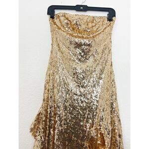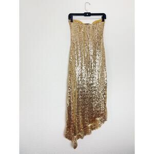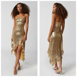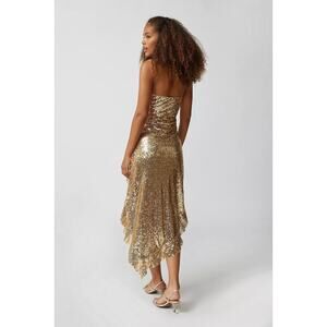 $100 NWT Urban Outfitters Stella Sequin Strapless Midi Dress Size Small Gold Asymmetric Hem