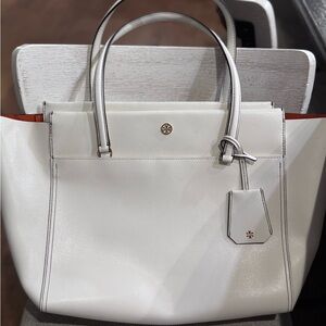 This elegant tan leather tote bag is perfect for any occasion. Its sleek design and high-quality material make it a must-have accessory. Ideal for both casual and formal settings. It does have 2 tiny scratches on the back sides pointed out.
