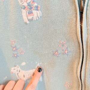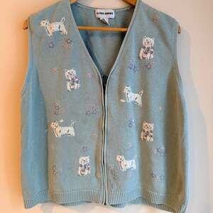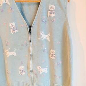 This vintage knit vest features adorable embroidered motifs including cats with scarves and dogs, accented by delicate floral embroidery. It is a full zip-front style in a soft pastel blue shade.