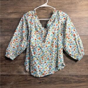 Charming floral blouse with ruffled neckline. Features vibrant colors and three-quarter sleeves. Ideal for casual outings.